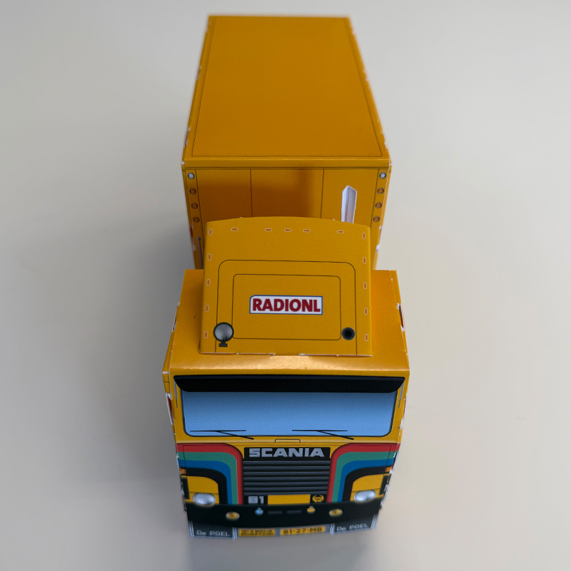 Deze bouwplaat van de iconische Scania 81 van Henk Wijngaard is een must-have voor liefhebbers van trucks en Nederlandse muziekgeschiedenis. Met deze gedetailleerde A3-bouwplaat haal je een stukje nostalgie in huis en bouw je zelf een miniatuur van de bekende gele truck.